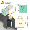 El contenedor cuenta con un cubo de 35 litros e incorpora una tapa de acero fija que, además de tapar los contenedores, actúa como estante para el interior del mueble para dejar bolsas de basura y accesorios de poco peso. El cubo posee un asa para facilitar la extracción y la limpieza de este. Válido para instalar en módulos de 45 con medidas interiores mínimas de profundidad 470 mm y altura 453 mm. Compatible con tableros de 16, 18 y 19 mm.