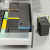 Las bases son recortables para lograr un ajuste perfecto al hueco útil del cajón donde se instale, mientras que los cubos incorporan asas de distintos colores para facilitar tanto la identificación de los residuos que contienen como su extracción para el vaciado y limpieza de los mismos.