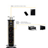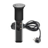 Conector multienchufe o torre de enchufes elevable está diseñado para aportar funcionalidad con su completa integración en el mueble de cocina, oficina y hogar. Está pensado para ser empotrado tanto en módulos altos como en módulos bajos gracias a su diseño retráctil de fácil extracción y ocultación manual. Se adapta perfectamente a los escritorios ya equipados con pasacables. Dispone de tres enchufes tipo Schuko con una potencia máxima admisible de hasta 3500W – 16A y de dos conectores USB para cargar dispositivos electrónicos 5V DC (1 x 1A / 2 x 0,5A) ideal para recargar smartphones y tablets. Su instalación resulta muy versátil ya que solo requiere de un mecanizado de D. 60 mm y tiene la posibilidad de montarse en superficies con gran espesor, entre 1 y 95 mm. Además se fija al mueble sin necesitad de herramientas gracias a una tuerca de fijación manual. Asimismo dispone de un discreto indicador LED de encendido y un cable de 1,8 m con enchufe para su funcionamiento a 230V AC 50Hz.