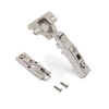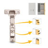 Para os fabricantes, este kit destaca-se pelo seu sistema de fixação com clipes, que facilita uma instalação rápida e precisa. O seu suplemento reto oculto sob o braço da dobradiça permite regular a altura através do parafuso excêntrico, optimizando os tempos de produção e adaptando-se a diferentes designs de móveis.